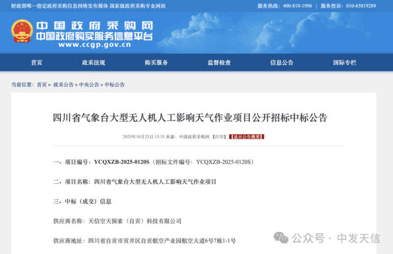 喜报 | 天信空天探索中标四川省大型无人机人工影响天气项目发表时间:2025-11-03 17:21 近日,国家政府采购平台“中国政府采购网”发布公告,中发天信子公司天信空天探索(自贡)科技有限公司成功中标“四川省气象台大型无人机人工影响天气作业项目”(项目编号:YCQXZB-2025-0120S),标志着天信空天探索在大型无人机气象服务领域的综合能力获得国家级采购体系认可。